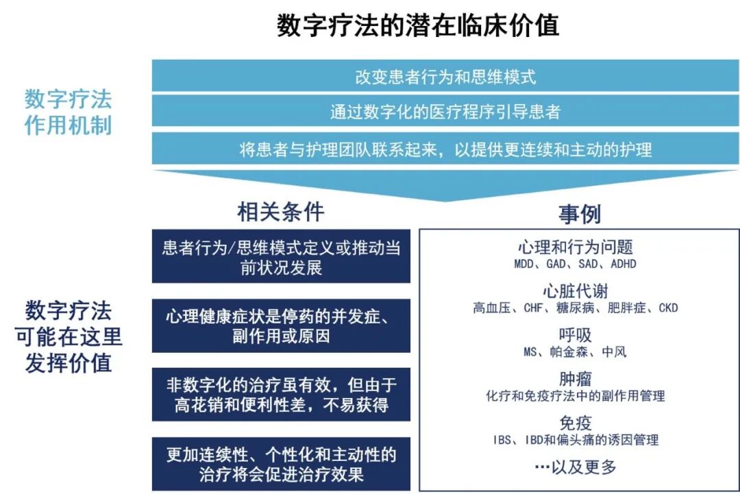 从这个⻆度来看,数字疗法有望在远远超出⼼理和⾏为健康的各种条件下发挥作⽤。